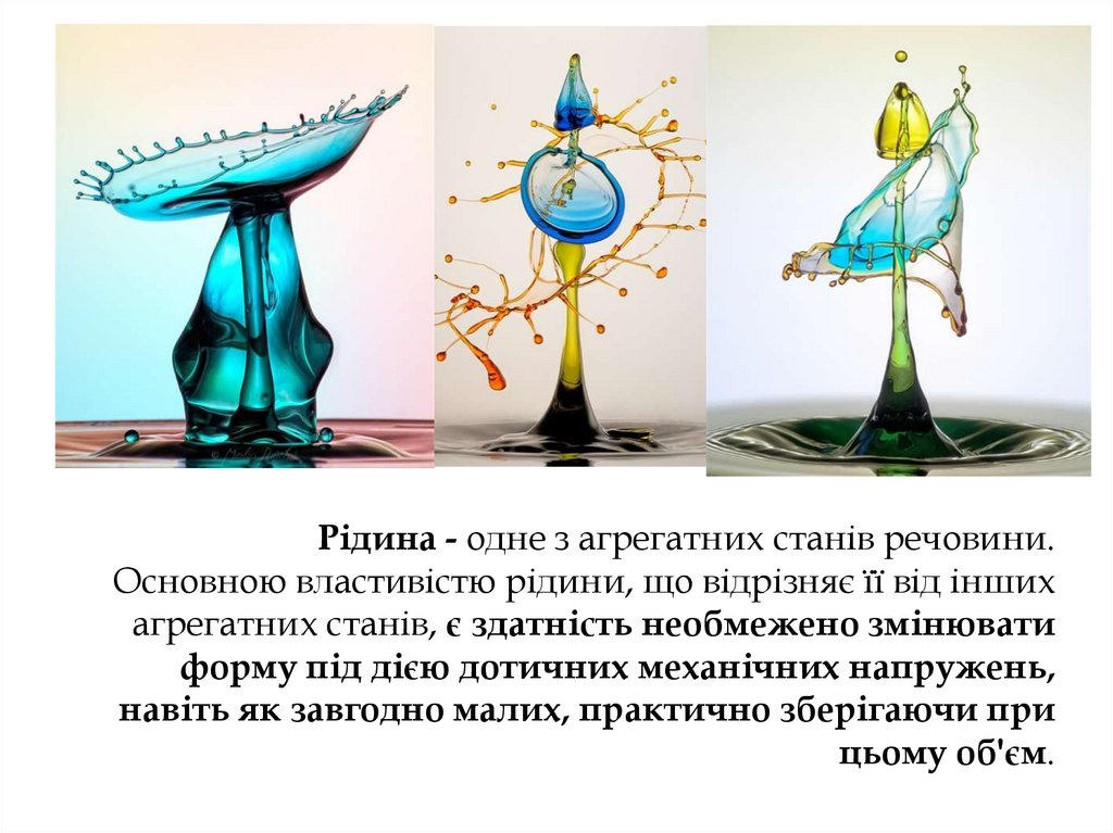 Рідина - одне з агрегатних станів речовини.Основною властивістю рідини, що відрізняє її від інших