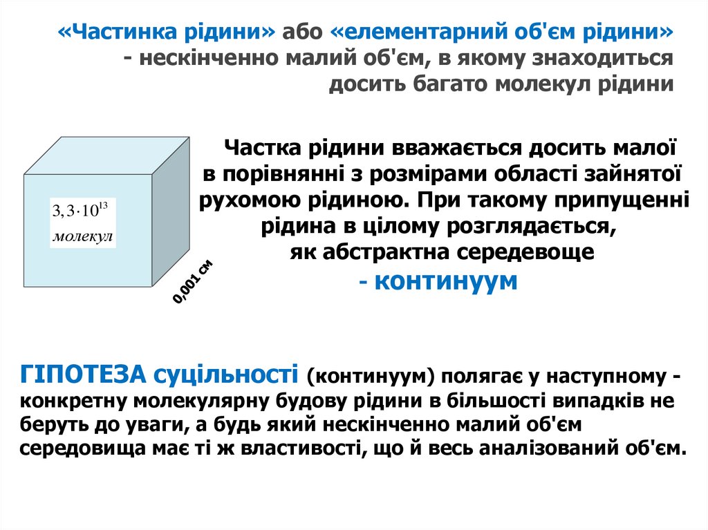 «Частинка рідини» або «елементарний об'єм рідини»- нескінченно малий об'єм, в якому знаходиться