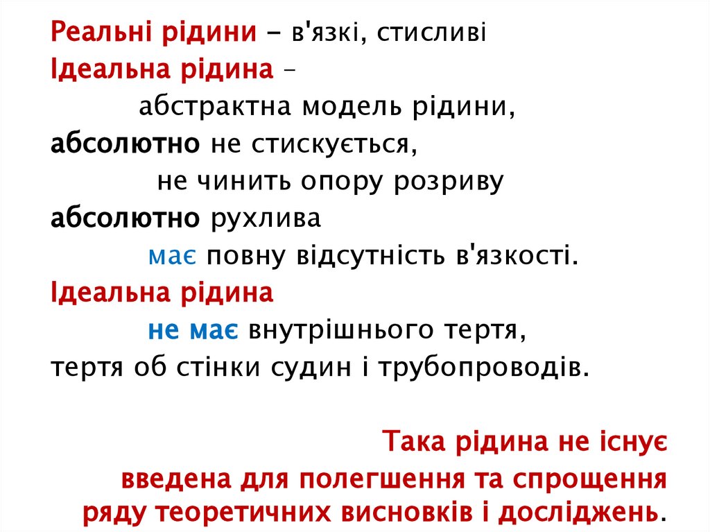 Реальні рідини - в'язкі, стисливіІдеальна рідина –