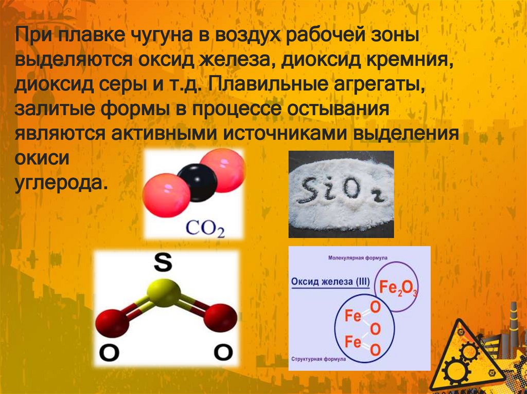 При плавке чугуна в воздух рабочей зонывыделяются оксид железа, диоксид кремния,