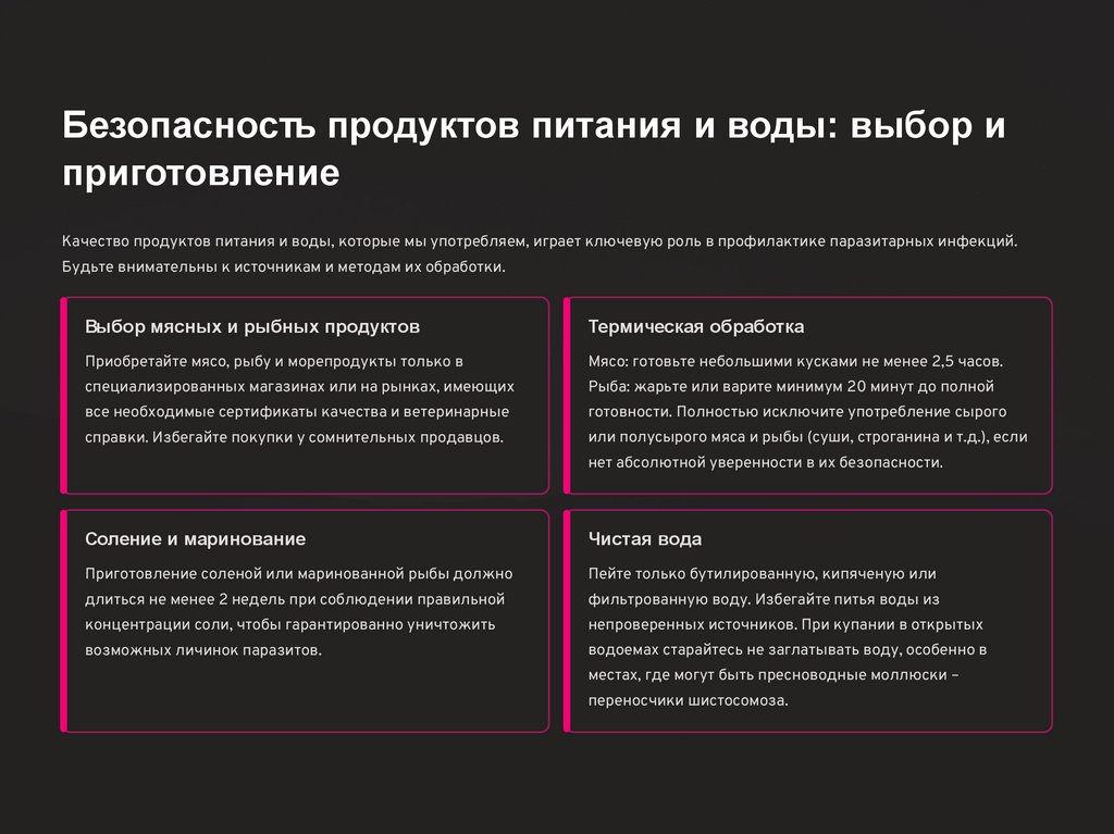 Качество продуктов питания и воды, которые мы употребляем, играет ключевую роль в профилактике паразитарных инфекций.