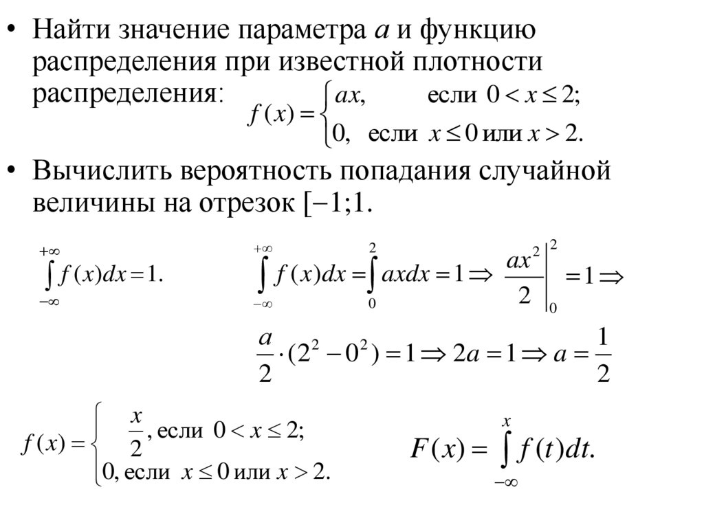 • Найти значение параметра а и функциюраспределения при известной плотности