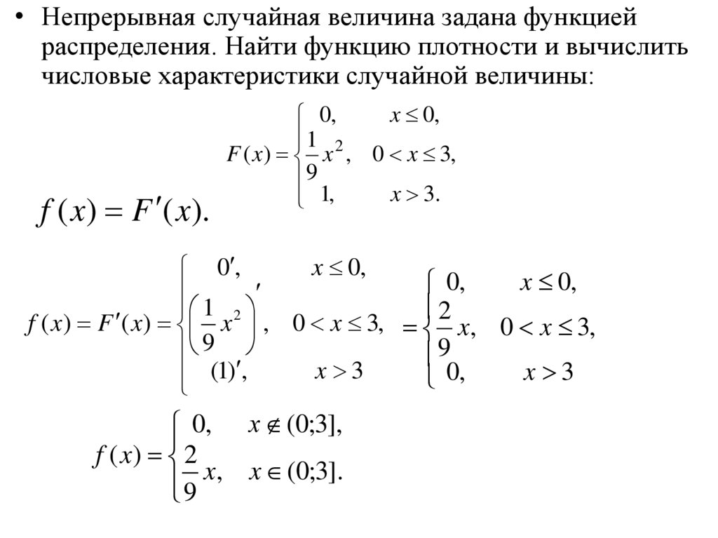 • Непрерывная случайная величина задана функциейраспределения. Найти функцию плотности и вычислить