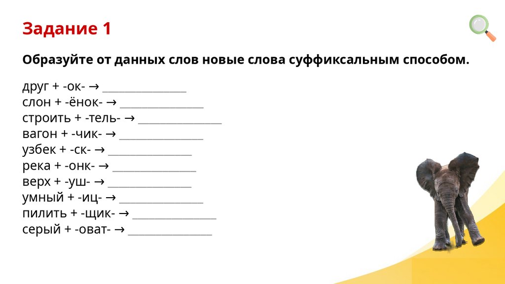 Задание 1Образуйте от данных слов новые слова суффиксальным способом.