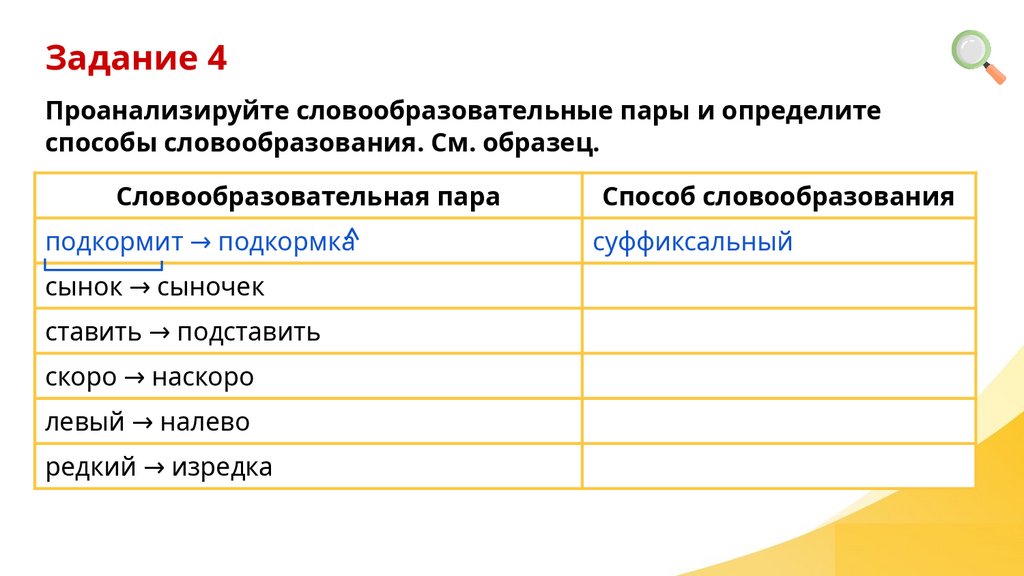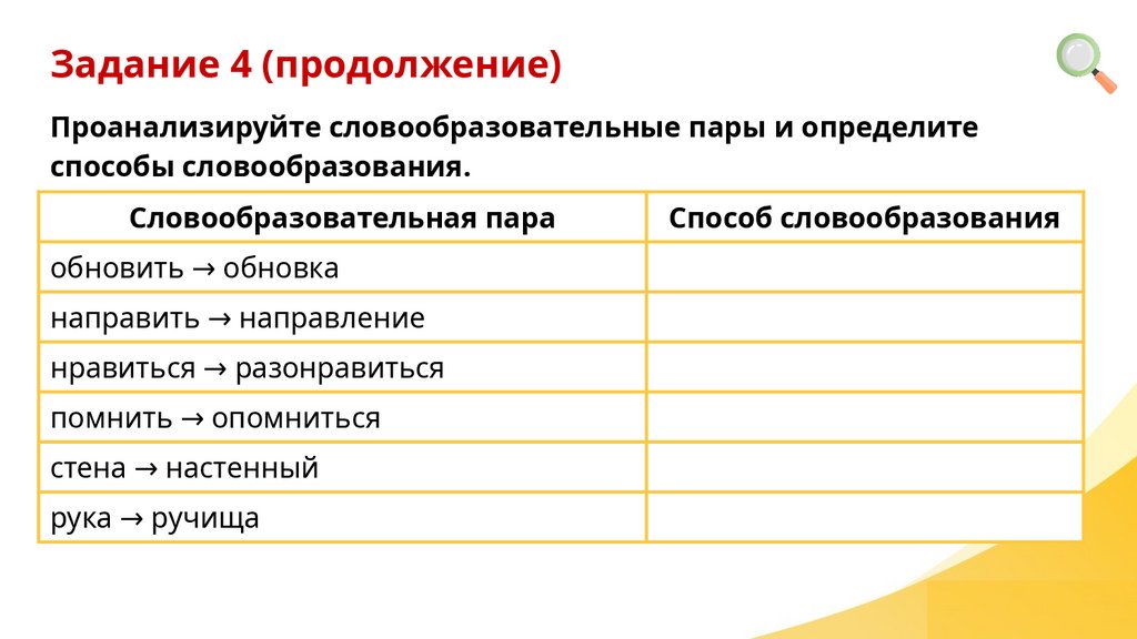 Задание 4 (продолжение)Проанализируйте словообразовательные пары и определите