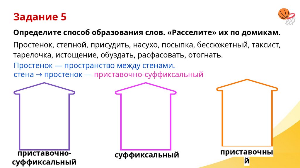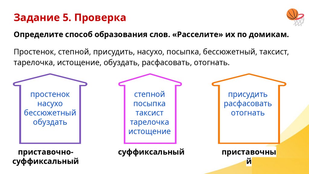 Задание 5. ПроверкаОпределите способ образования слов. «Расселите» их по домикам.