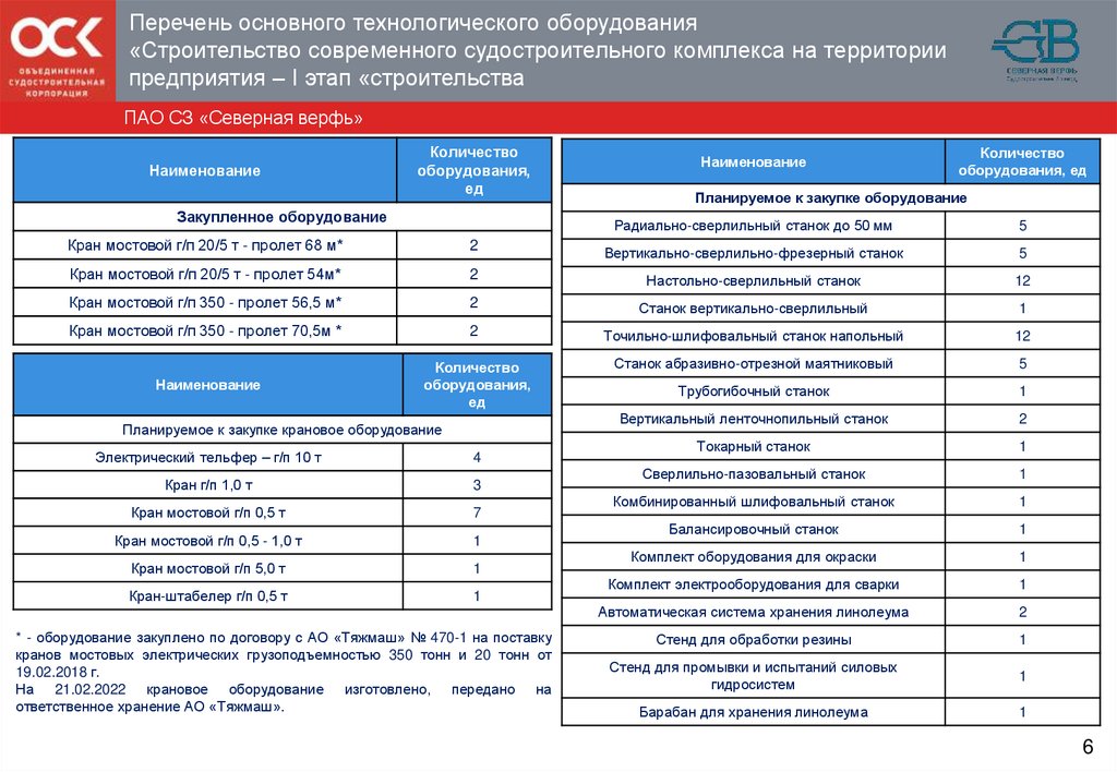 Перечень основного технологического оборудования«Строительство современного судостроительного комплекса на территории