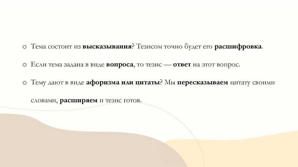 o Тема состоит из высказывания? Тезисом точно будет его расшифровка.o Если тема задана в виде вопроса, то тезис — ответ на этот вопрос.