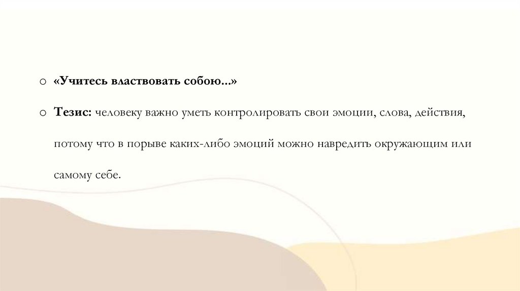 o «Учитесь властвовать собою...»o Тезис: человеку важно уметь контролировать свои эмоции, слова, действия,