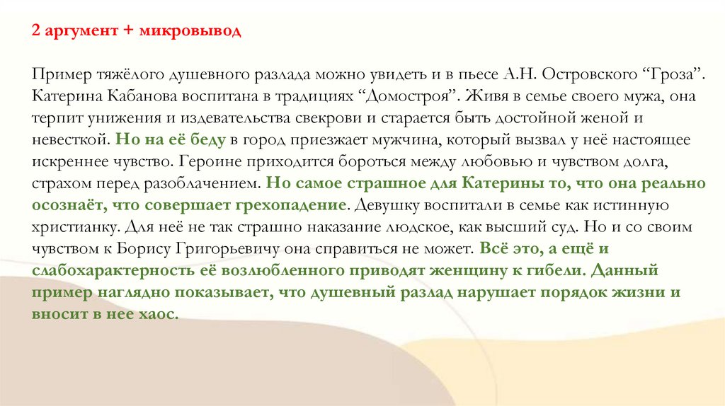 2 аргумент + микровыводПример тяжёлого душевного разлада можно увидеть и в пьесе А.Н. Островского “Гроза”.