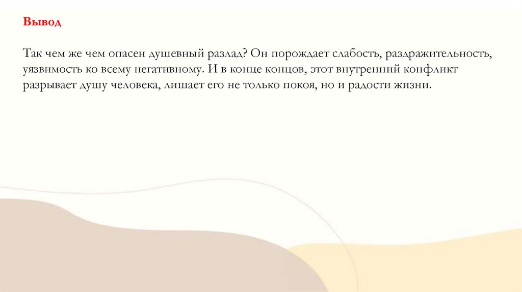 ВыводТак чем же чем опасен душевный разлад? Он порождает слабость, раздражительность,