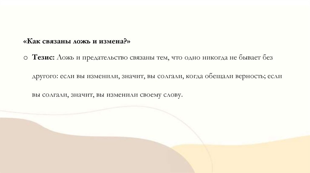 «Как связаны ложь и измена?»o Тезис: Ложь и предательство связаны тем, что одно никогда не бывает без