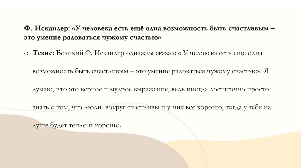 o Тезис: Великий Ф. Искандер однажды сказал: « У человека есть ещё одна
