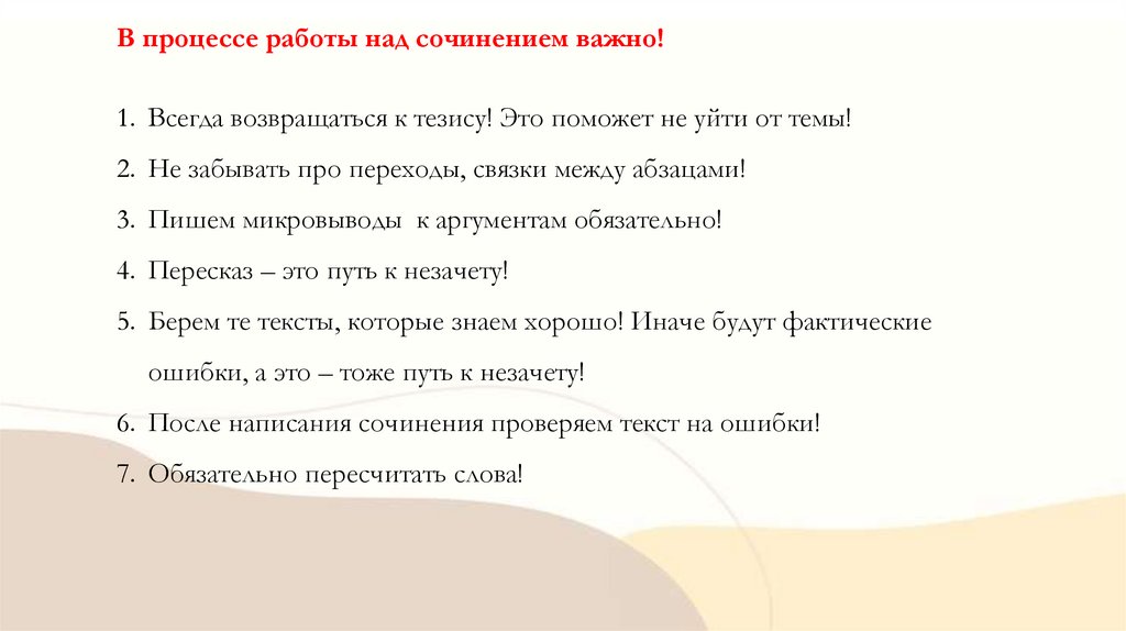 В процессе работы над сочинением важно!1. Всегда возвращаться к тезису! Это поможет не уйти от темы!