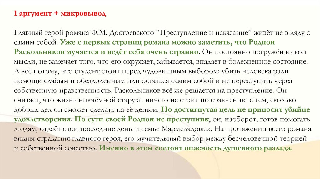 1 аргумент + микровыводГлавный герой романа Ф.М. Достоевского “Преступление и наказание” живёт не в ладу с