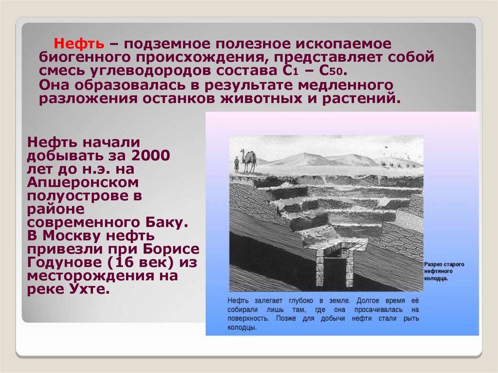 Нефть – подземное полезное ископаемоебиогенного происхождения, представляет собой
