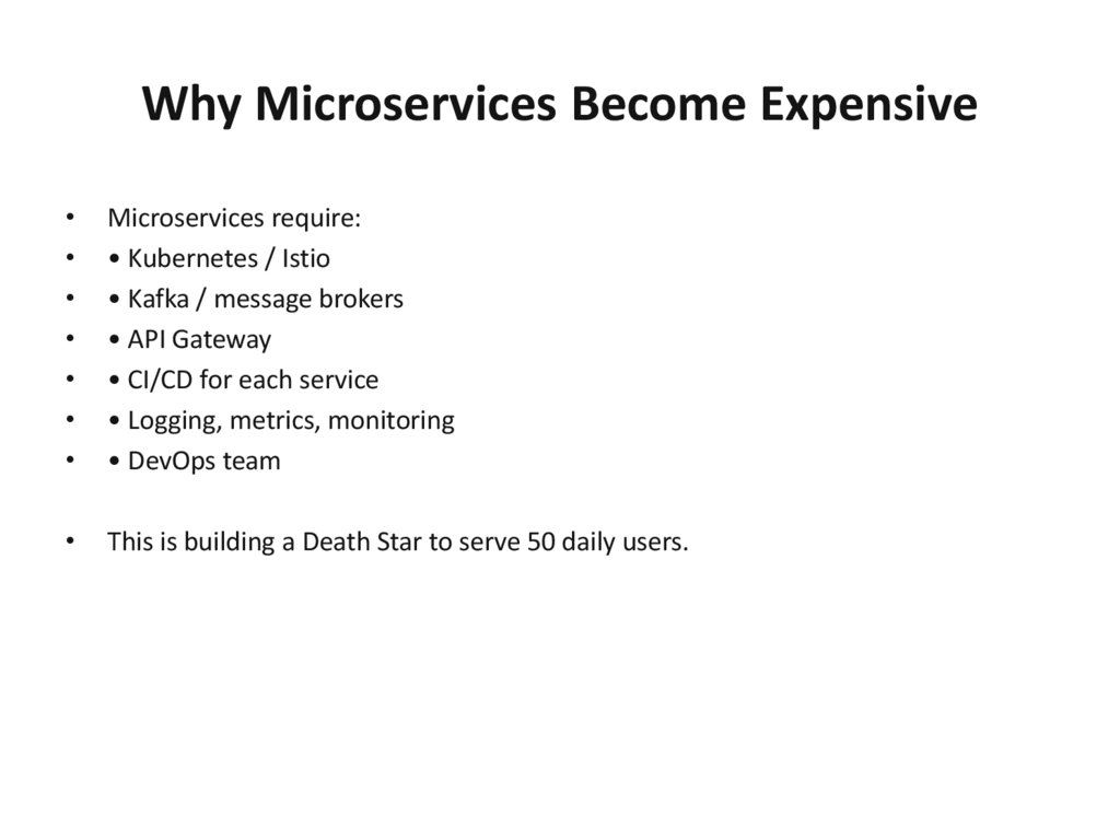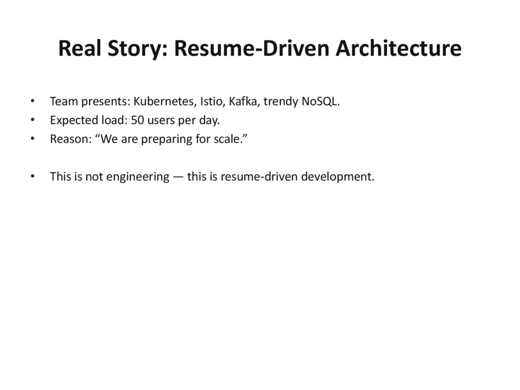 Real Story: Resume-Driven ArchitectureTeam presents: Kubernetes, Istio, Kafka, trendy NoSQL.