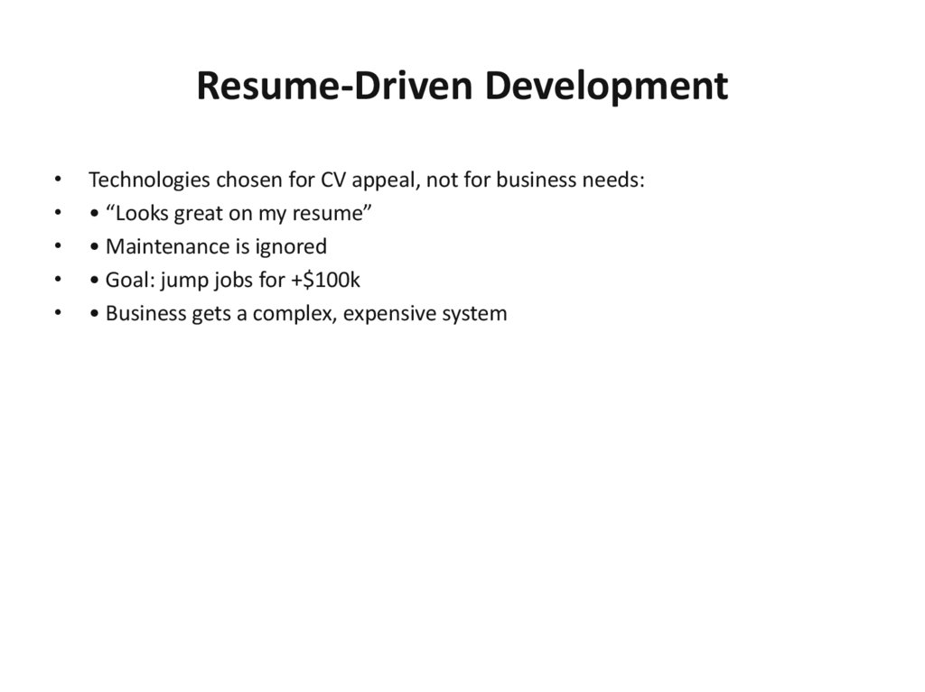 Resume-Driven DevelopmentTechnologies chosen for CV appeal, not for business needs: