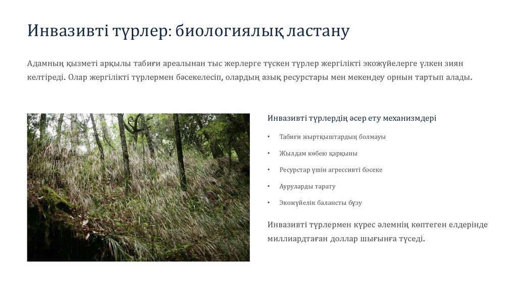 Инвазивті түрлер: биологиялық ластануАдамның қызметі арқылы табиғи ареалынан тыс жерлерге түскен түрлер жергілікті экожүйелерге үлкен зиян