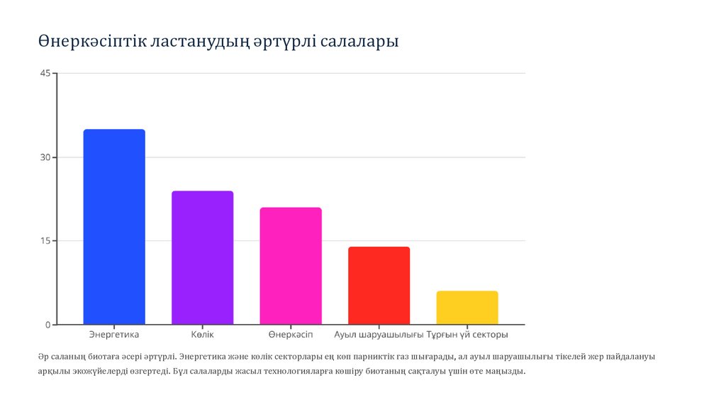 Өнеркәсіптік ластанудың әртүрлі салаларыӘр саланың биотаға әсері әртүрлі. Энергетика және көлік секторлары ең көп парниктік газ шығарады, ал ауыл шаруашылығы тікелей жер пайдалануы