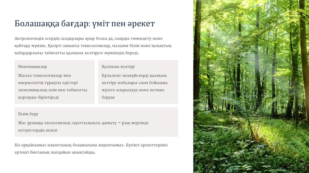 Болашаққа бағдар: үміт пен әрекетАнтропогендік әсердің салдарлары ауыр болса да, оларды төмендету және