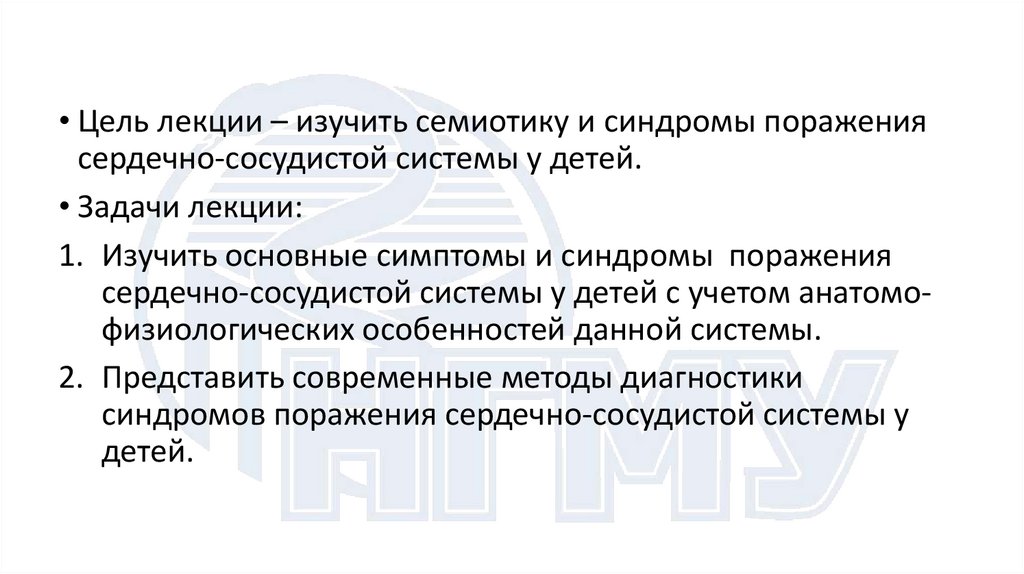 • Цель лекции – изучить семиотику и синдромы поражениясердечно-сосудистой системы у детей.
