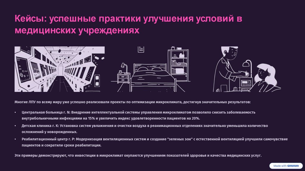 Эти примеры демонстрируют, что инвестиции в микроклимат окупаются улучшением показателей здоровья и качества медицинских услуг.
