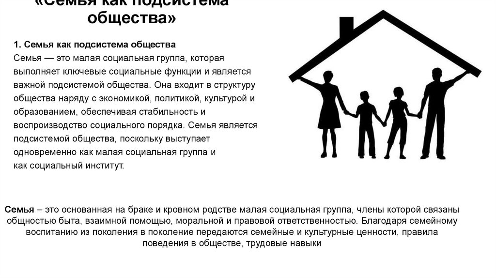 1. Семья как подсистема обществаСемья — это малая социальная группа, которая