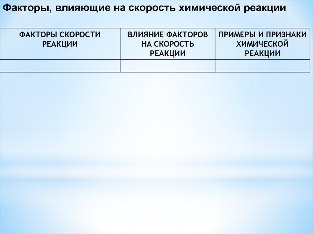 Факторы, влияющие на скорость химической реакцииФАКТОРЫ СКОРОСТИ РЕАКЦИИ