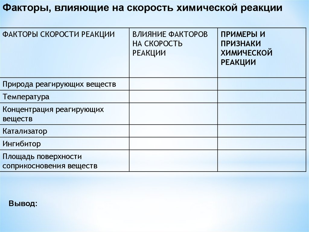 Факторы, влияющие на скорость химической реакцииФАКТОРЫ СКОРОСТИ