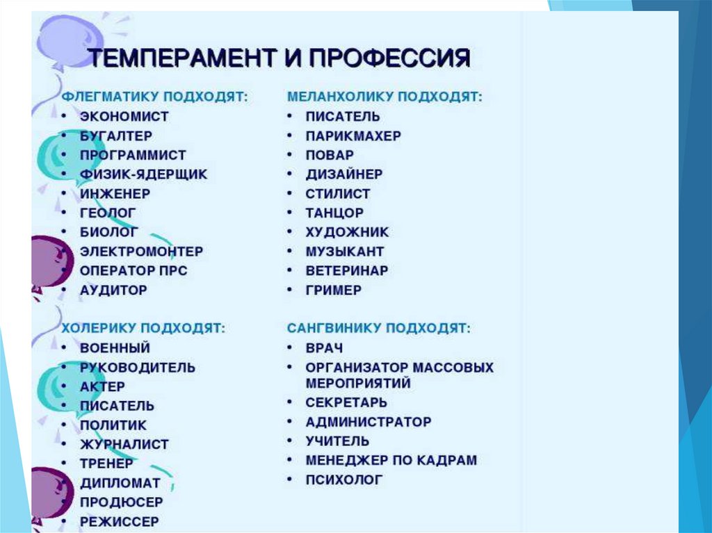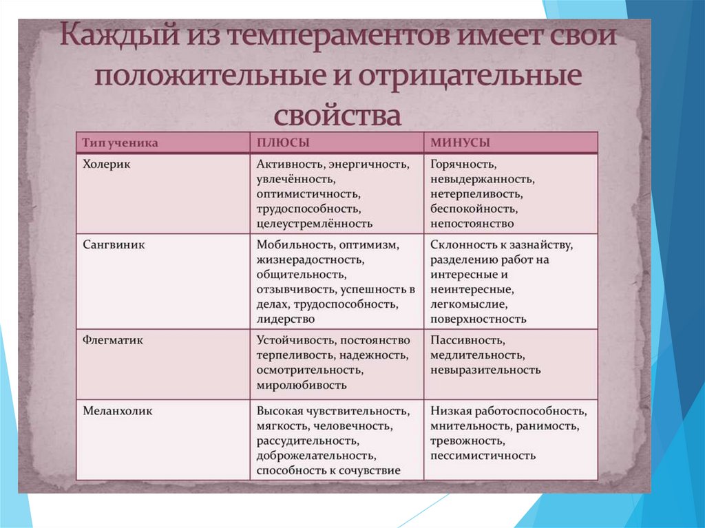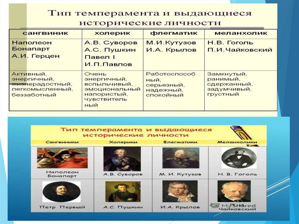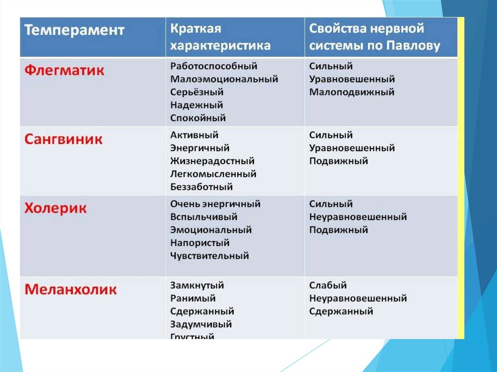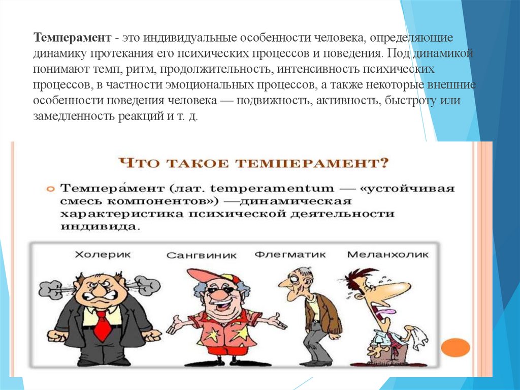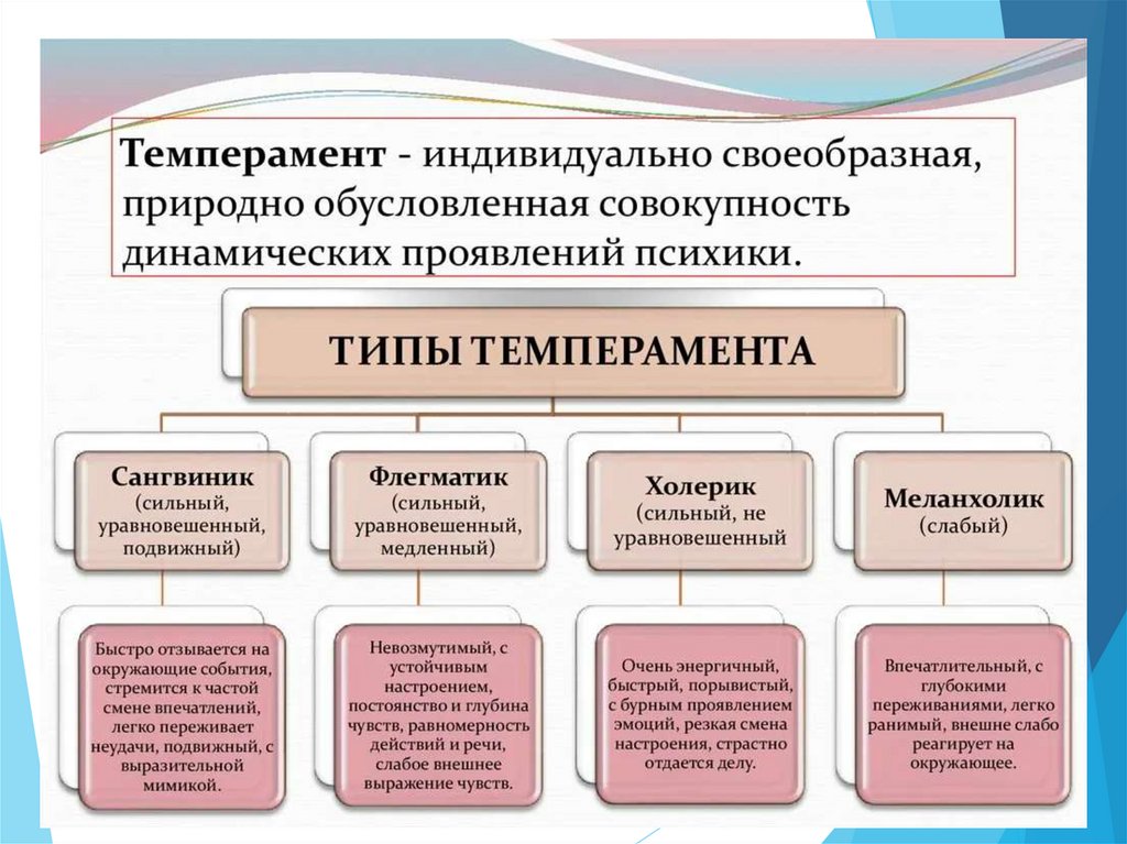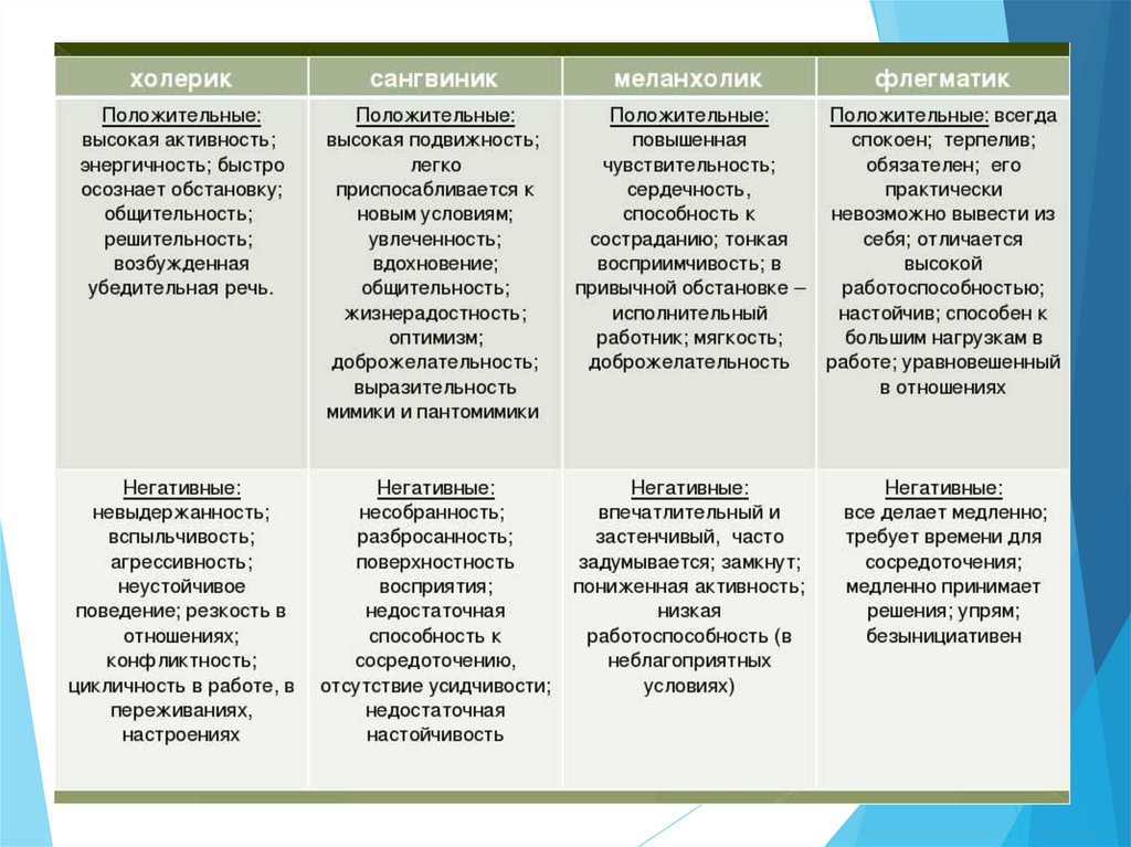холерик, сангвиник, флегматик и меланхолик. Соотношение