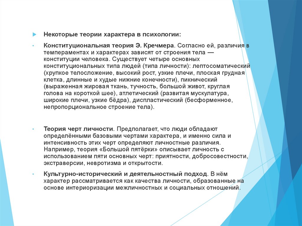 Некоторые теории характера в психологии:Конституциональная теория Э. Кречмера. Согласно ей, различия в