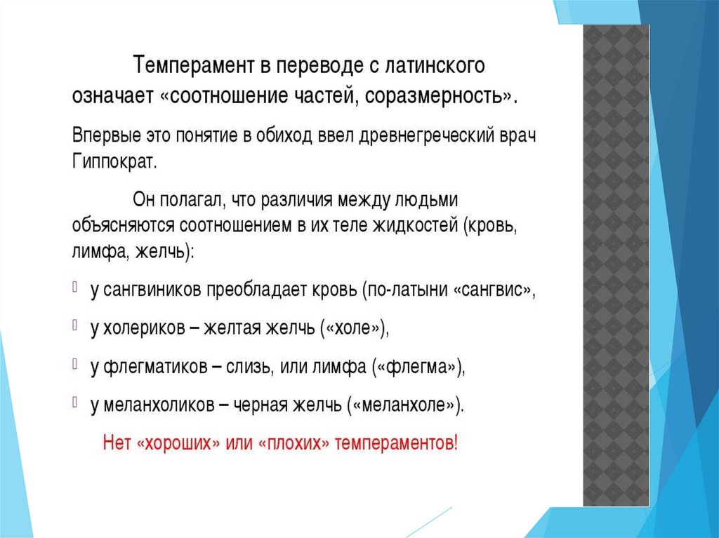 биологической жидкости (гумора), преобладающей в его теле. Он