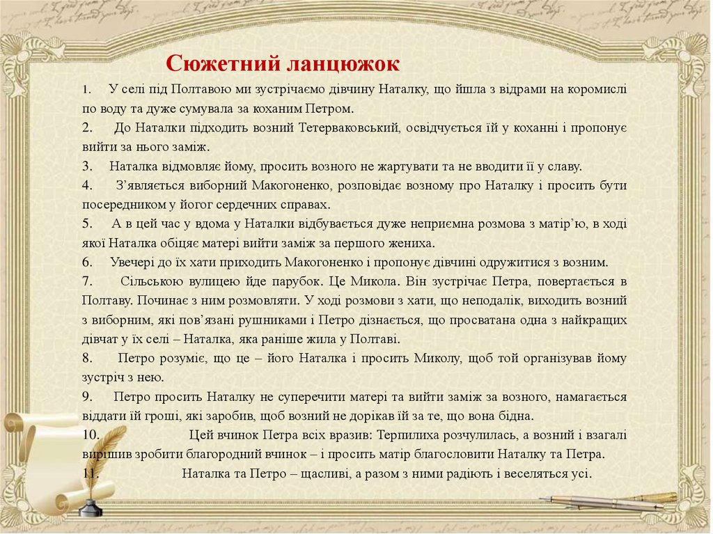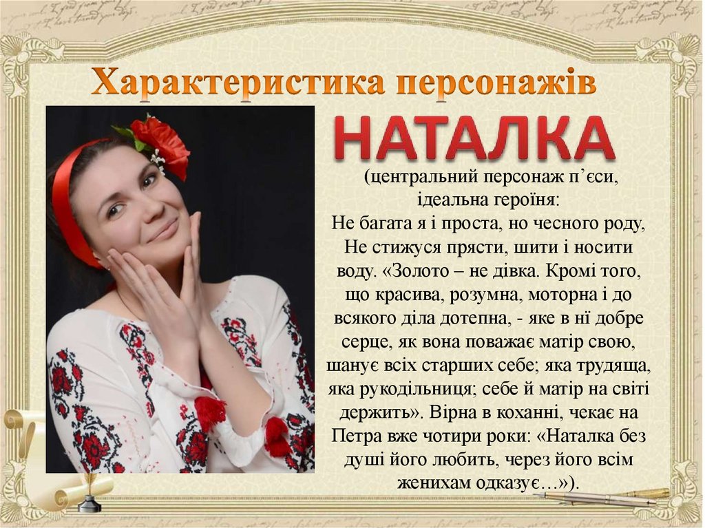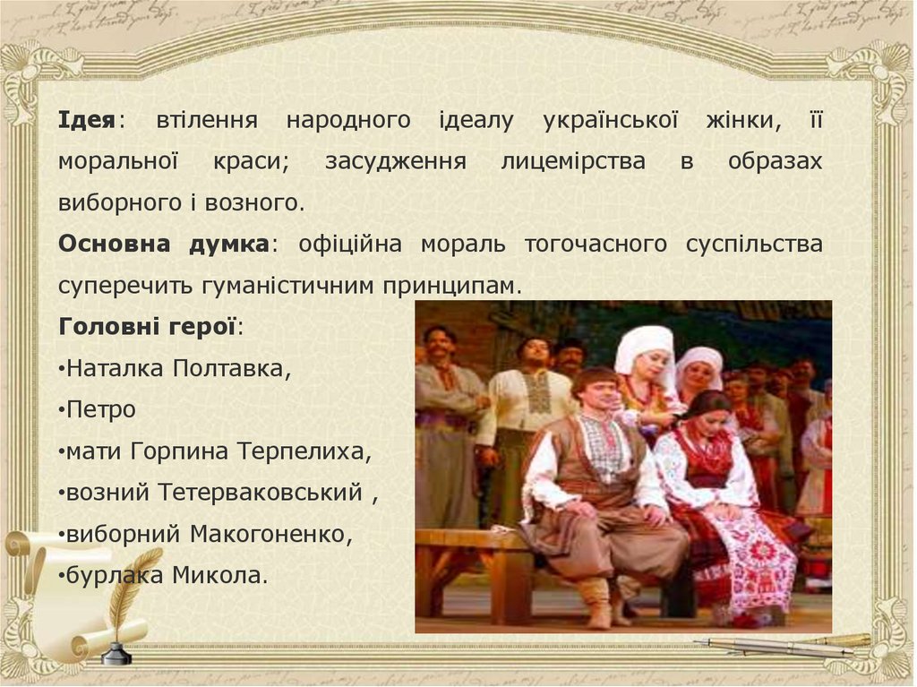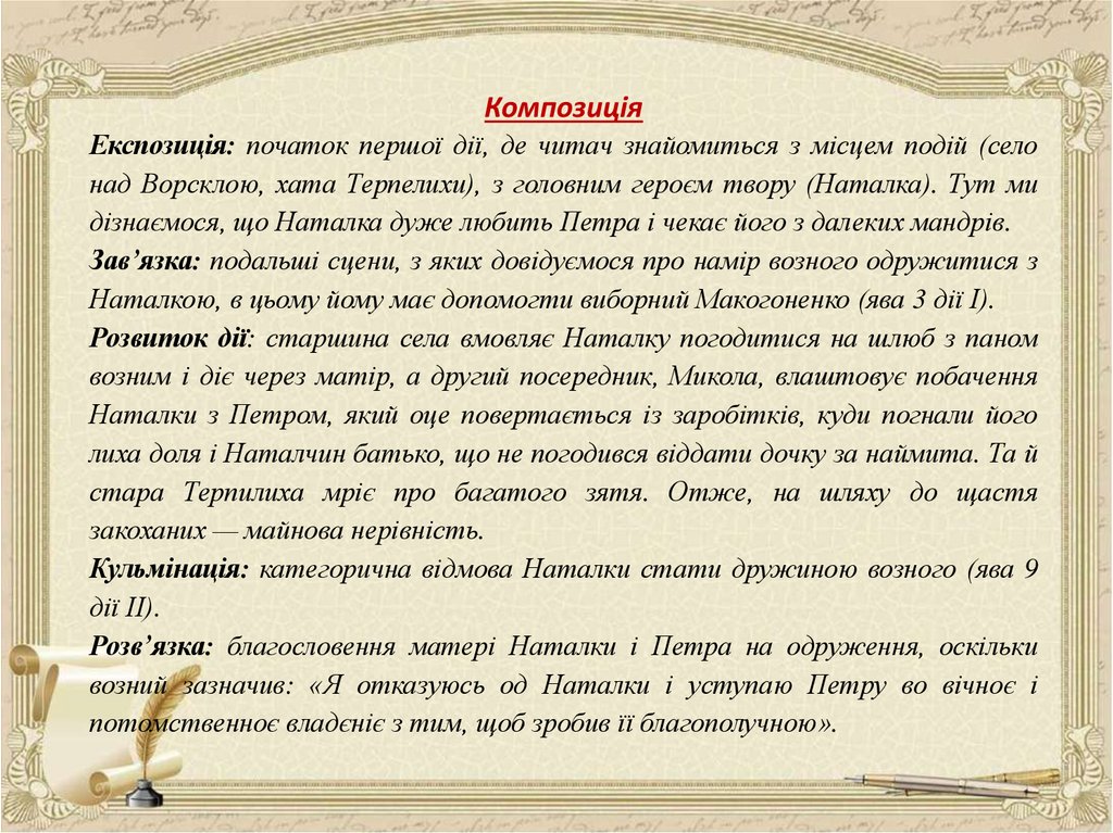 над Ворсклою, хата Терпелихи), з головним героєм твору (Наталка). Тут ми