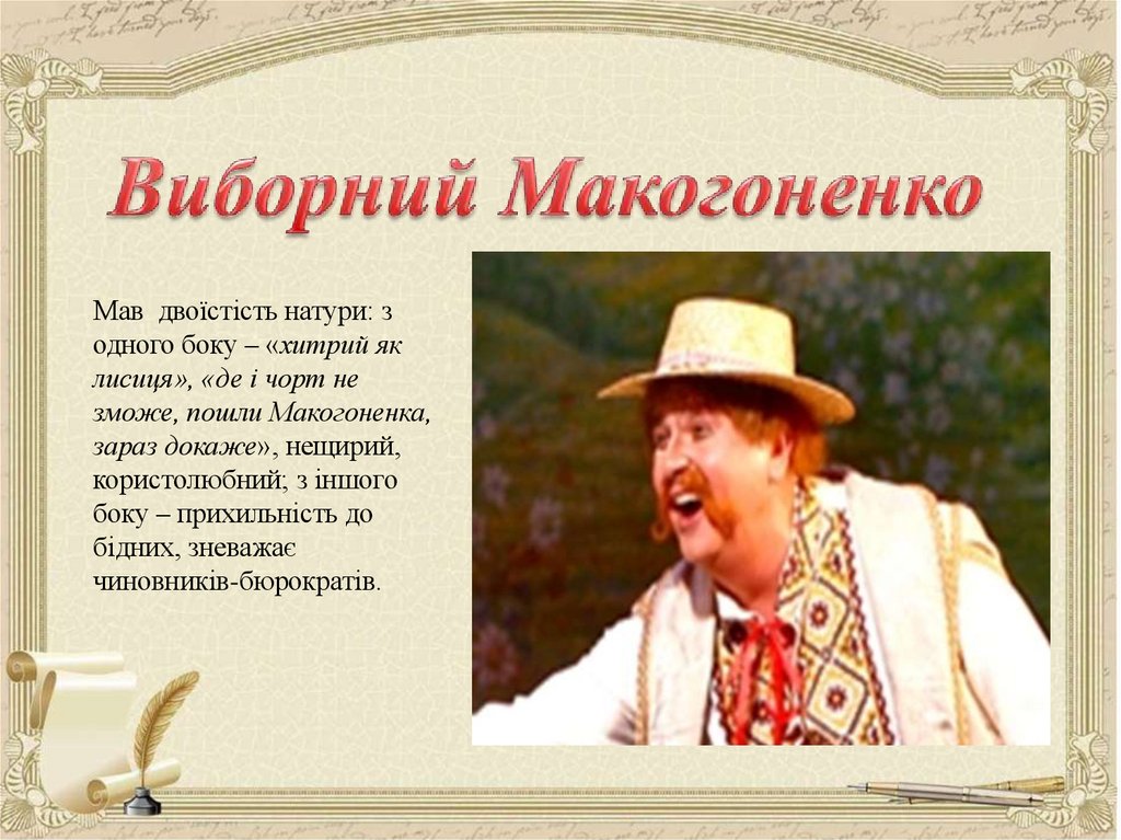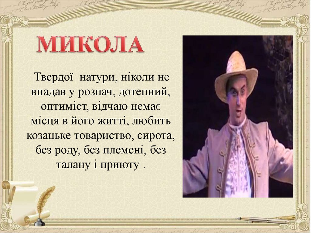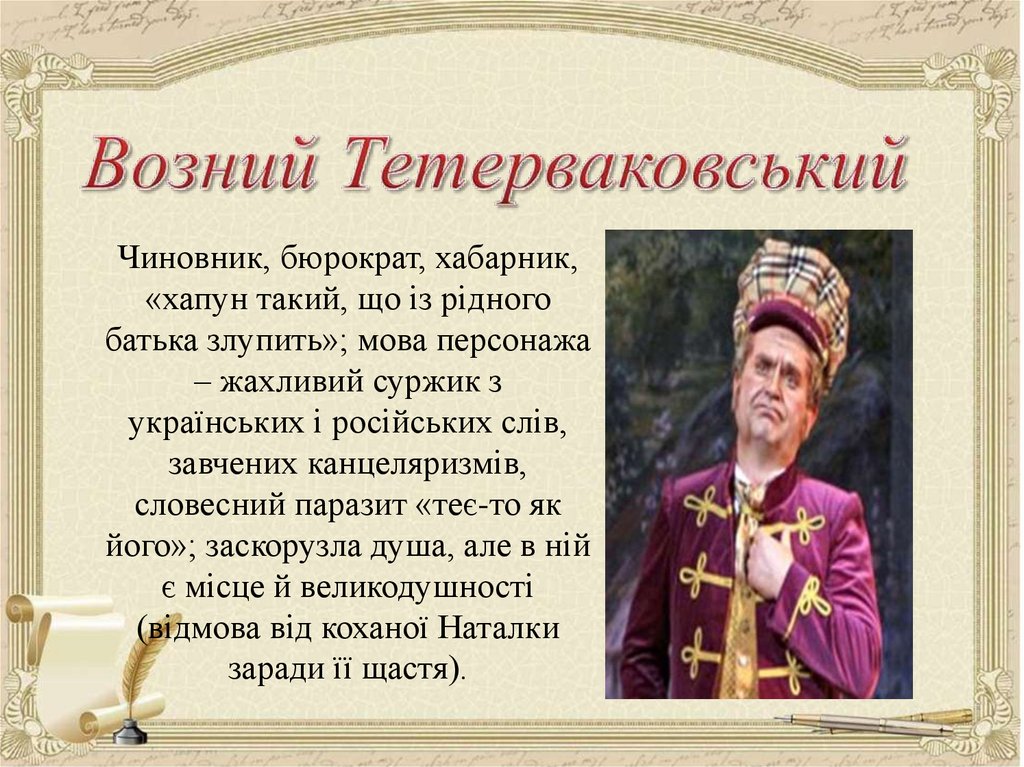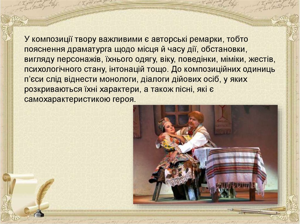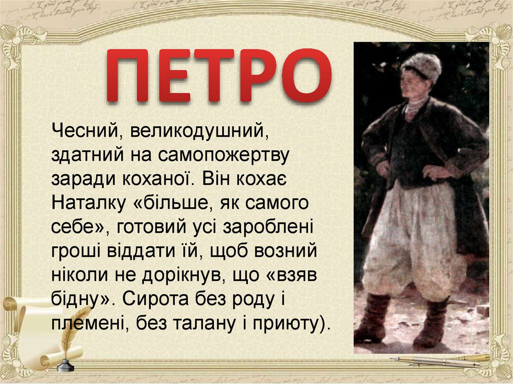 над Ворсклою, хата Терпелихи), з головним героєм твору (Наталка). Тут ми
