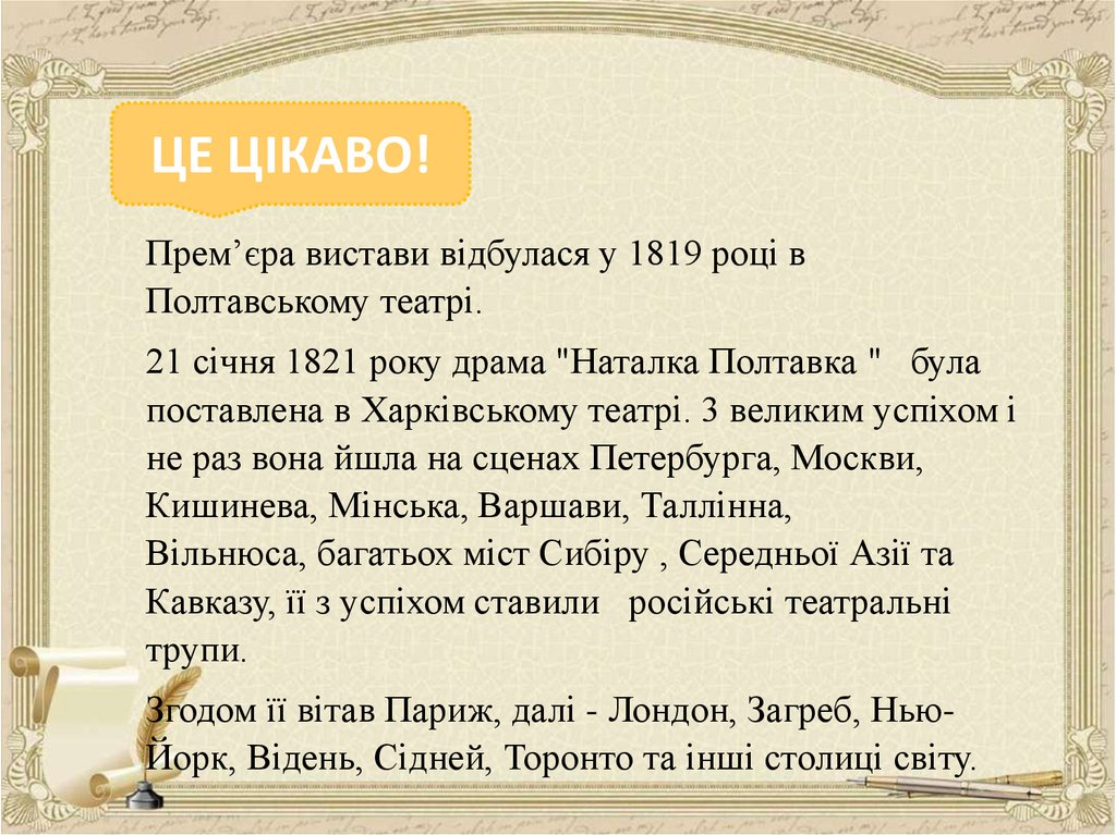 ЦЕ ЦІКАВО!Прем’єра вистави відбулася у 1819 році в