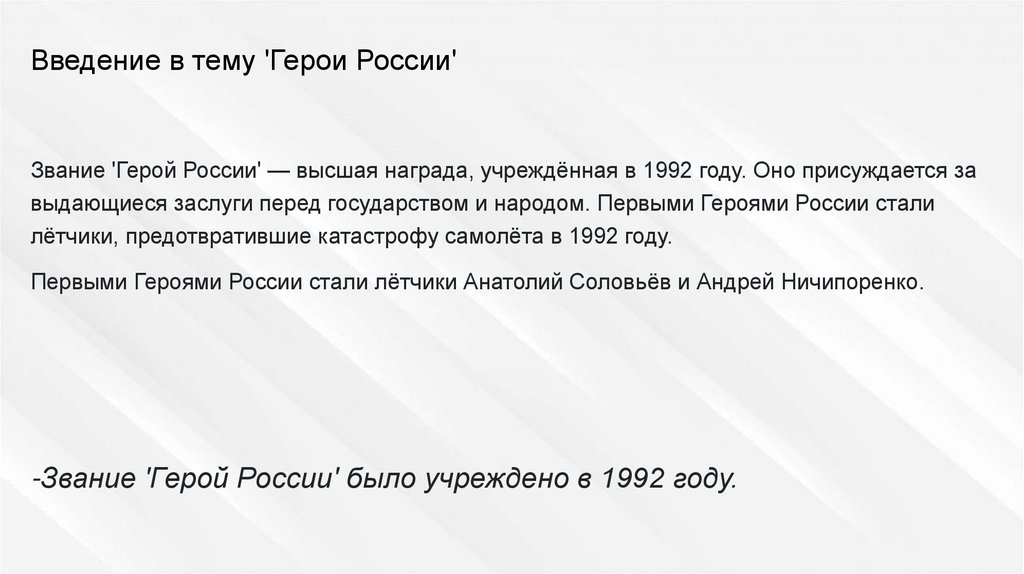 Введение в тему 'Герои России'Звание 'Герой России' — высшая награда, учреждённая в 1992 году. Оно присуждается за