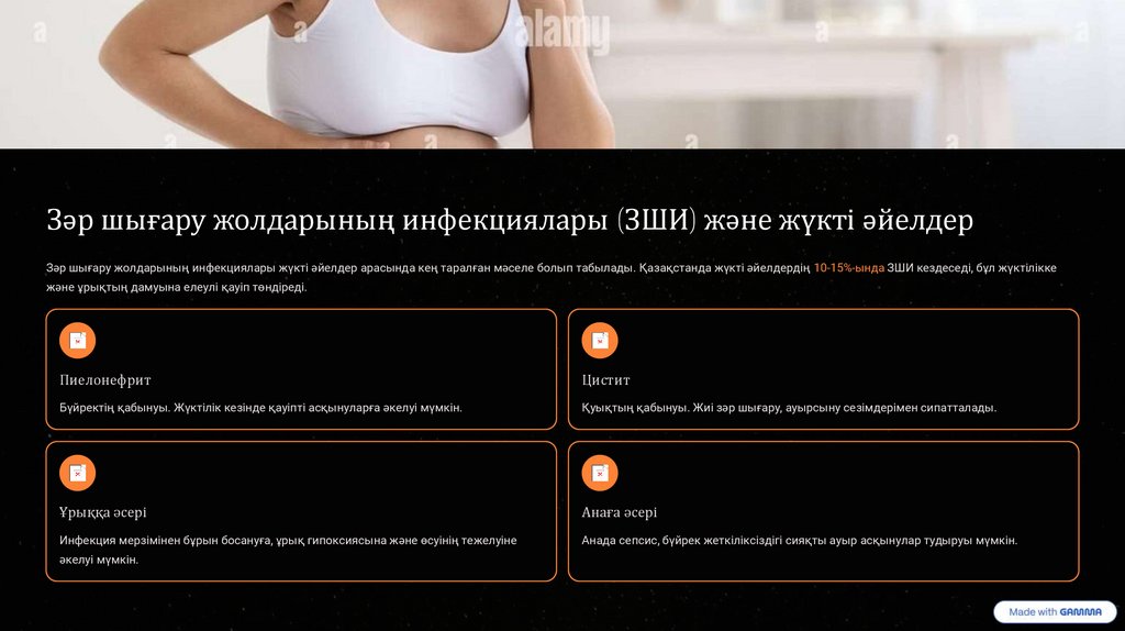 Зәр шығару жолдарының инфекциялары (ЗШИ) және жүкті әйелдерЗәр шығару жолдарының инфекциялары жүкті әйелдер арасында кең таралған мәселе болып табылады. Қазақстанда жүкті әйелдердің 10-15%-ында ЗШИ кездеседі, бұл жүктілікке
