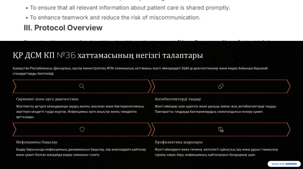 ҚР ДСМ КП №36 хаттамасының негізгі талаптарыҚазақстан Республикасы Денсаулық сақтау министрлігінің №36 клиникалық хаттамасы жүкті әйелдердегі ЗШИ-ді диагностикалау және емдеу бойынша бірыңғай