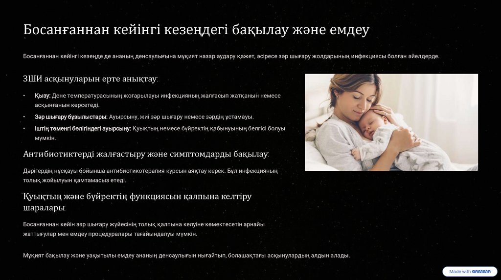 Босанғаннан кейінгі кезеңдегі бақылау және емдеуБосанғаннан кейінгі кезеңде де ананың денсаулығына мұқият назар аудару қажет, әсіресе зәр шығару жолдарының инфекциясы болған әйелдерде.