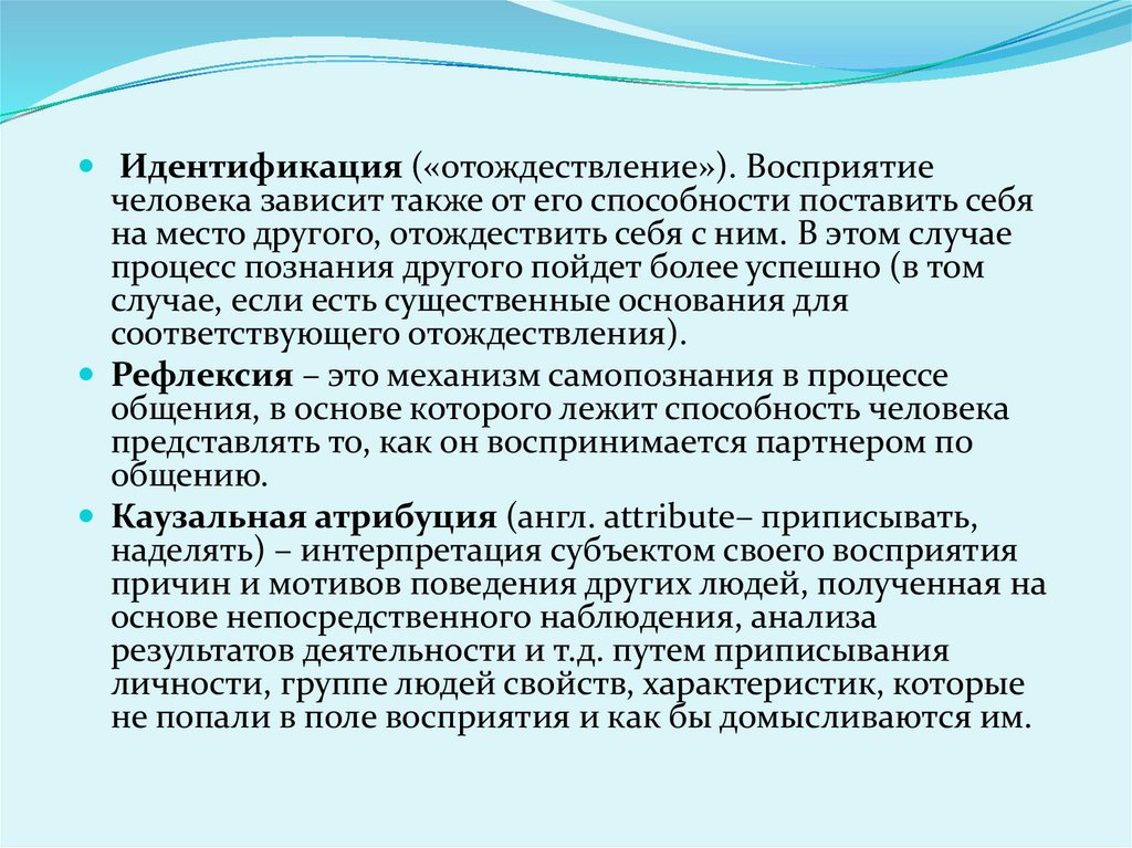 Идентификация («отождествление»). Восприятиечеловека зависит также от его способности поставить себя