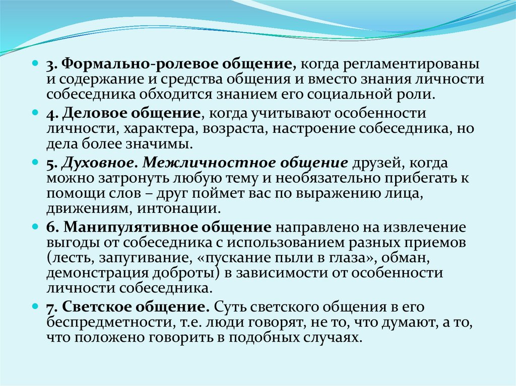 3. Формально-ролевое общение, когда регламентированыи содержание и средства общения и вместо знания личности