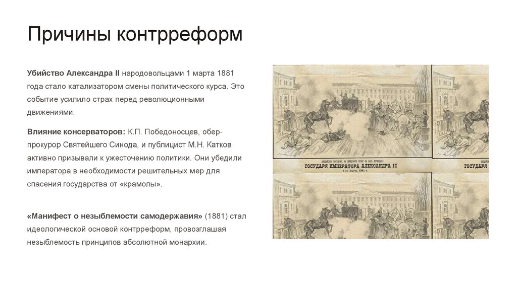 Причины контрреформУбийство Александра II народовольцами 1 марта 1881