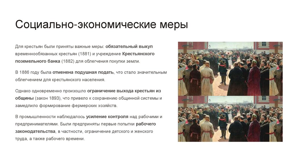 Социально-экономические мерыДля крестьян были приняты важные меры: обязательный выкуп