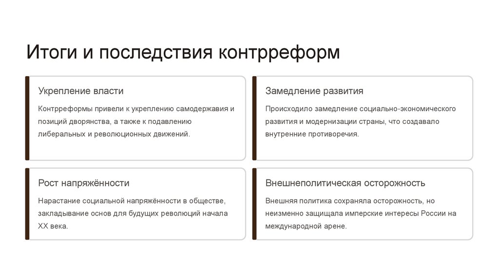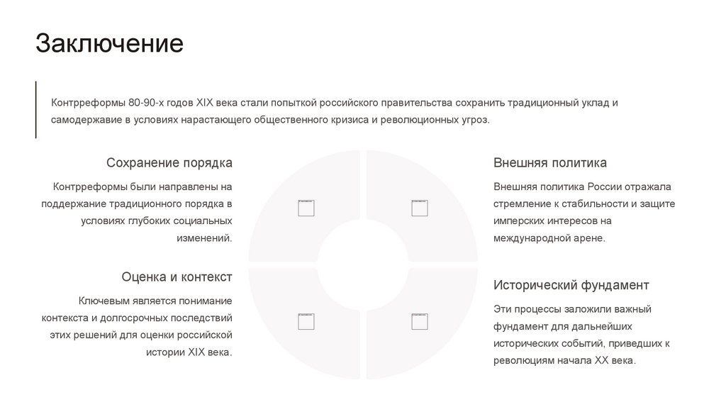 ЗаключениеКонтрреформы 80-90-х годов XIX века стали попыткой российского правительства сохранить традиционный уклад и