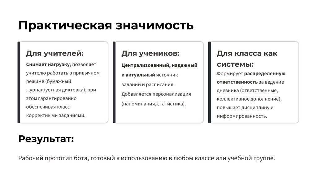 Рабочий прототип бота, готовый к использованию в любом классе или учебной группе.