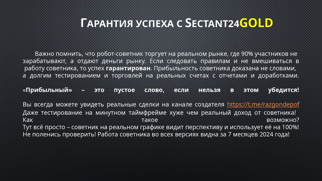 ГАРАНТИЯ УСПЕХА С SECTANT24GOLDВажно помнить, что робот-советник торгует на реальном рынке, где 90% участников не