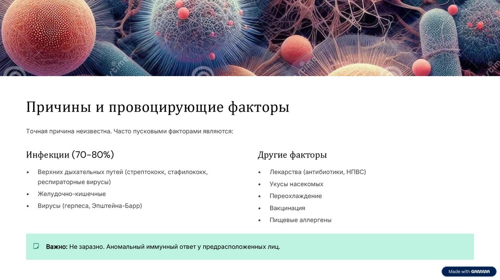 Важно: Не заразно. Аномальный иммунный ответ у предрасположенных лиц.