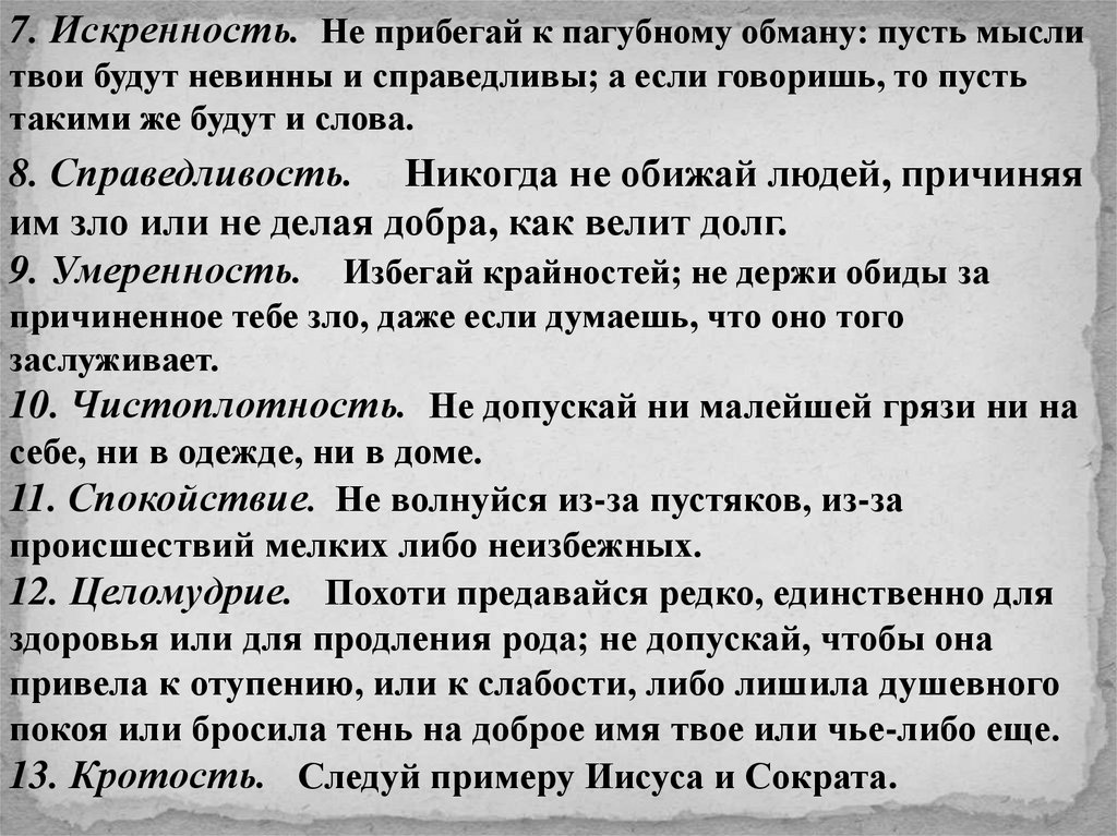 7. Искренность. Не прибегай к пагубному обману: пусть мыслитвои будут невинны и справедливы; а если говоришь, то пусть