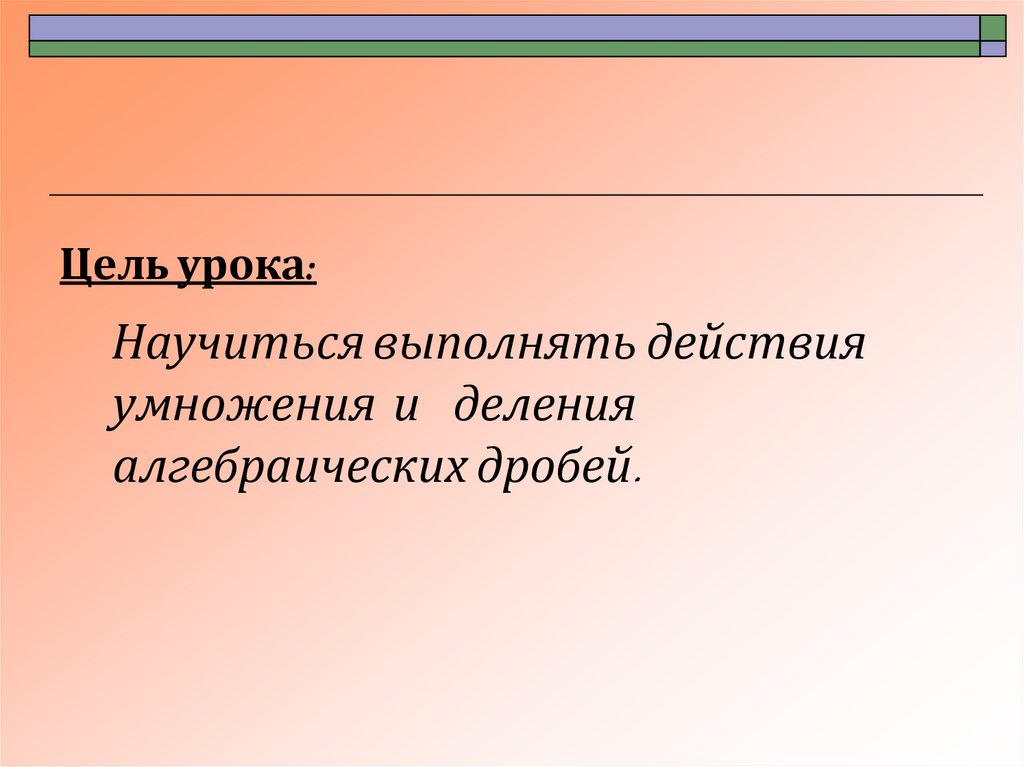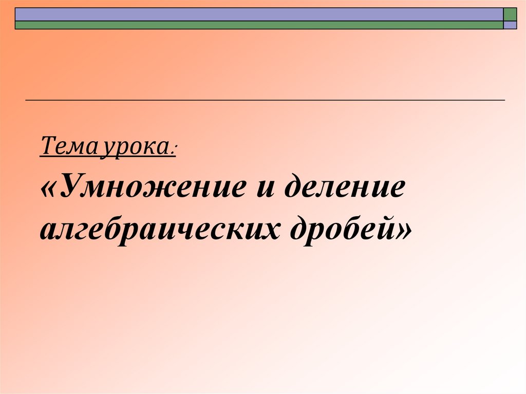 1. Тема урока: «Умножение и деление алгебраических дробей»
